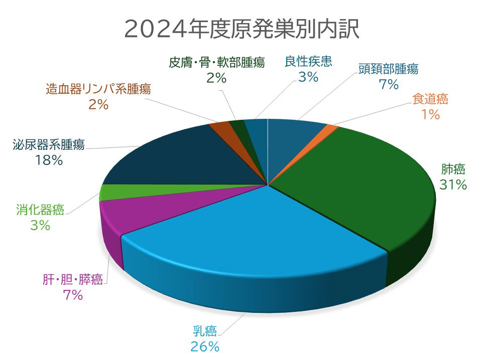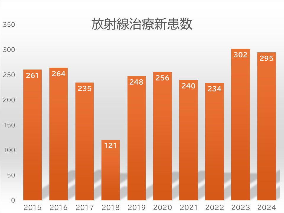 年間約300名の新しい患者さんを治療させていただいています。 全身のいろいろな部位に発生した悪性腫瘍の治療に関わっています。 また、治療の目的も、根治的(完全治癒を目指した治療)なものから、対症的(症状の緩和を目指した治療)なものまで幅広いので、悪性腫瘍に罹患されたすべての患者さん方に関わらせていただく可能性があります。