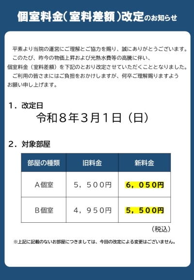 個室料改訂のお知らせ